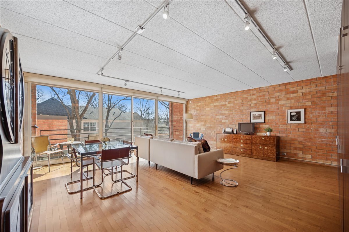 Welcome home to sophisticated multi-level living in up-town Glencoe! Experience a city like lifestyle just steps to shops, dining, Metra, parks, schools, Writers Theatre, Green Bay trail & Glencoe beach, Lake Michigan!! This top floor 2 bed 2 bath unit in an elevator equipped building features ample sunlight, architecturally exposed brick walls, graciously sized rooms and a lot of storage! The modern kitchen boasts quartz counters, beautiful cream subway tile backsplash, & a new refrigerator (Jan 26). A large dining and living room includes a fabulous wall of windows allowing for ample sunlight and a sliding door leads to a private balcony. There are two bedrooms, the larger primary bedroom includes a walk in closet. An in-unit washer/dryer, one (1) heated underground parking space (#9), a large garage storage room, and newer (installed June 23) Air Conditioner complete the unit. Move right in and enjoy all the conveniences of town! Pets Welcome.